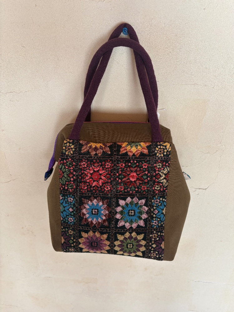 帯や柿渋などを使って布の組み合わせやミシンキルトなどで、世界にたった一つだけのバッグやポーチなどを作っています。