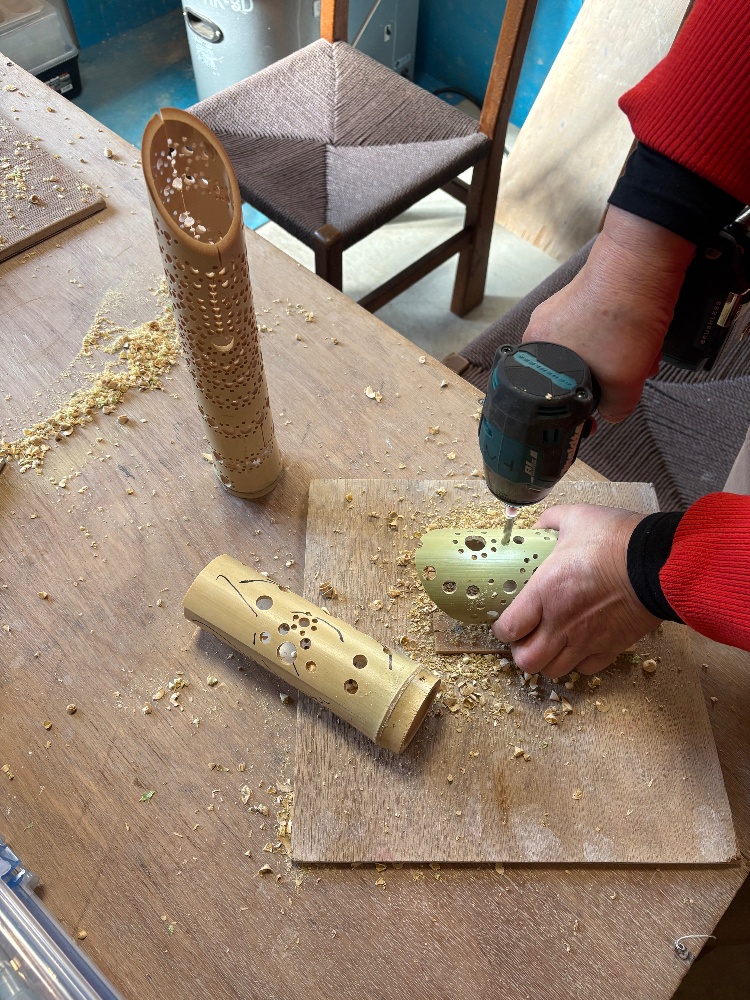 竹のオブジェに挑戦してみました。見るのとやるのでは大違い。なかなか上手に出来ません。とても根気の必要な穴あけでした。やり始めるとどんどん穴を開けたくなりましたが、適当なところでやめました。手が超痛くなりましたが、灯りをつけると良い感じになったので満足しました。ぜひぜひ挑戦してみてください。
